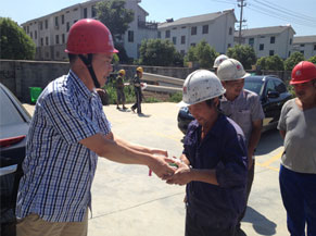 近日氣溫節(jié)節(jié)攀升,酷暑考驗(yàn)著堅(jiān)守在浙江東廈公司的一線職工,更牽動(dòng)著公司領(lǐng)導(dǎo)的心。7月31日,公司領(lǐng)導(dǎo)王董、朱總、施副總等一行帶著防暑降溫慰問(wèn)品來(lái)到嵊州和悅時(shí)代廣場(chǎng)悅公館、紹興佳源廣場(chǎng)、濱海新城醫(yī)療器械科技產(chǎn)業(yè)園、柯橋中銀國(guó)際大廈等工地現(xiàn)場(chǎng),親切慰問(wèn)了堅(jiān)守在項(xiàng)目部現(xiàn)場(chǎng)的一線職工,詢問(wèn)他們?cè)诟邷靥鞖庀碌墓ぷ?、生活情況,代表公司對(duì)一線職工高溫下堅(jiān)守崗位、辛勞工作表示肯定和感謝,叮囑職工在當(dāng)前持續(xù)高溫的不利條件下,做好安全工作的同時(shí),要?jiǎng)谝萁Y(jié)合,注意休息,采取有效的防暑措施,安全順利地度過(guò)高溫季節(jié),保質(zhì)保量的完成工作。領(lǐng)導(dǎo)的一聲聲問(wèn)候和贊譽(yù),給一線的職工送去了盛夏的縷縷清涼,他們紛紛表示要加倍努力工作,保障自身安全,穩(wěn)定生產(chǎn)運(yùn)行,為建筑工程事業(yè)獻(xiàn)出自己的力量。