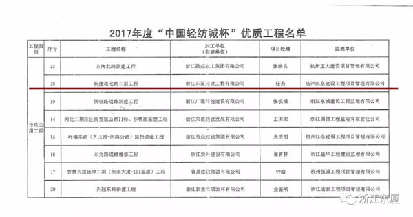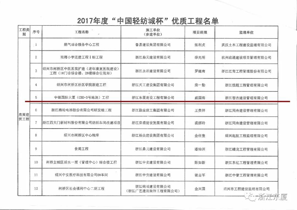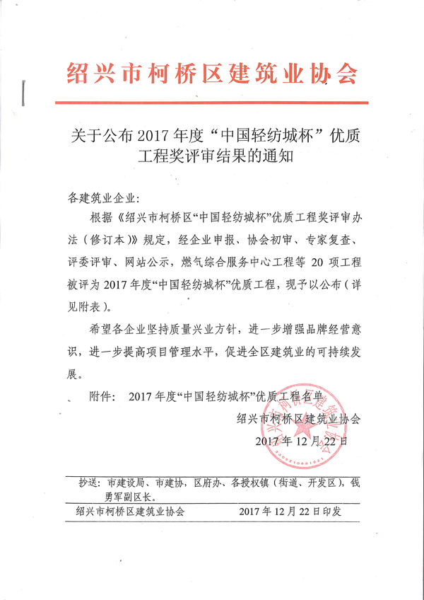 同時,中銀國際大廈(CBD-3號地塊)工程和濱海新建北七路二項工程近日均被紹興市柯橋區(qū)建筑業(yè)協(xié)會評為2017年度“中國輕紡城杯”優(yōu)質(zhì)工程獎。