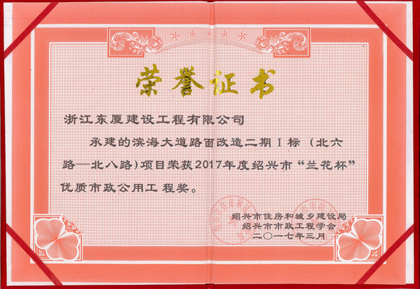 近年來,各項目部深入開展創(chuàng)優(yōu)奪杯工作,近日在紹興市市政工程學(xué)會2017年度會員大會上,我司首次被評為“2017年紹興市市政行業(yè)先進(jìn)單位”,承建的市政工程濱海大道路面改造二期I標(biāo)(北六路-北八路)榮獲2017年度紹興市“蘭花杯”優(yōu)質(zhì)市政公用工程獎。