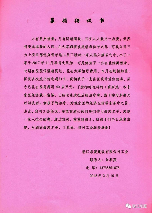我司優(yōu)秀青年員工、鳳凰創(chuàng)新園項目部施工員丁勝標(biāo)同志自去年11月喜得龍鳳雙胞胎以來,因倆孩子身體不好,長期住院治療,最近又進入重癥監(jiān)護室,醫(yī)院多次發(fā)出病危通知書,大量的醫(yī)療費給小丁家?guī)砹四蟮耐纯唷?br />          病魔無情,東廈有愛。丁勝標(biāo)一家的遭遇牽動著東廈每個人的心,為幫助小丁家度過難關(guān),我司工會率先發(fā)出了募捐倡議書,短短二天時間已籌集資金9萬余元。丁勝標(biāo)家的困難也引起了鎮(zhèn)政府領(lǐng)導(dǎo)的關(guān)心,2月12日下午,楊汛橋鎮(zhèn)黨委副書記沈建祥和鎮(zhèn)黨委委員蔣利強代表鎮(zhèn)總工會前來我公司,送來了給丁勝標(biāo)同志2000元的慰問金,帶來暖心的問候。