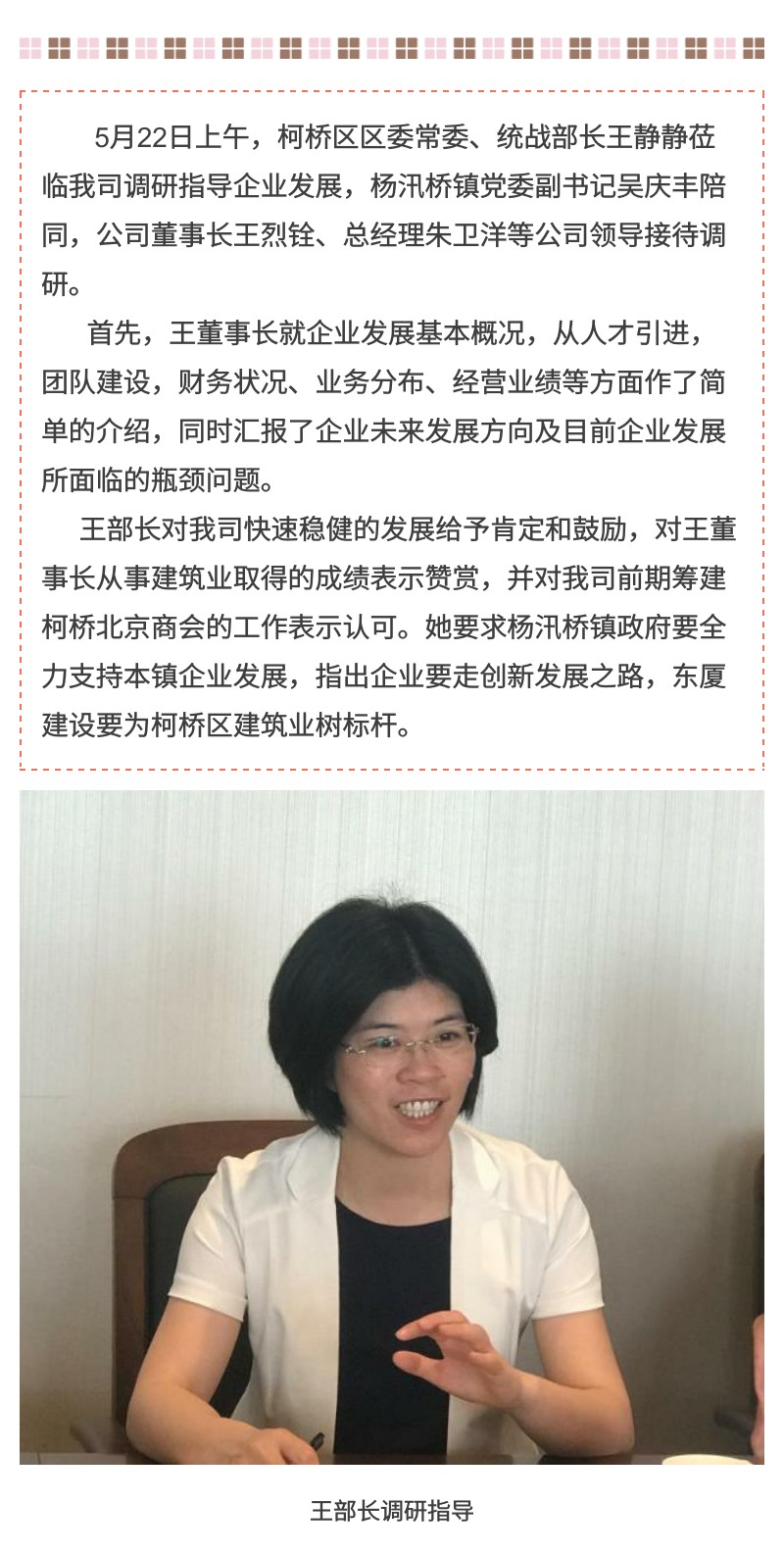 柯橋區(qū)委常委、統(tǒng)戰(zhàn)部部長王靜靜蒞臨東廈調(diào)研指導