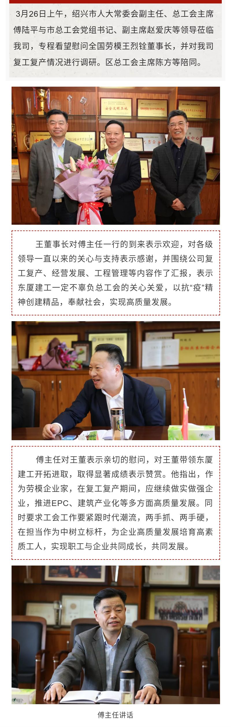 紹興市人大常委會(huì)副主任、市總工會(huì)主席傅陸平一行到我司慰問王烈銓董事長
