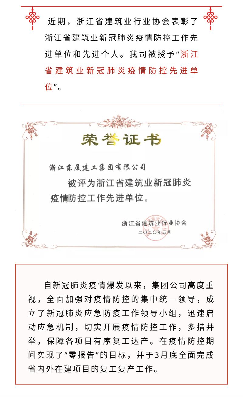 公司榮獲“浙江省建筑業(yè)新冠肺炎疫情防控先進(jìn)單位”