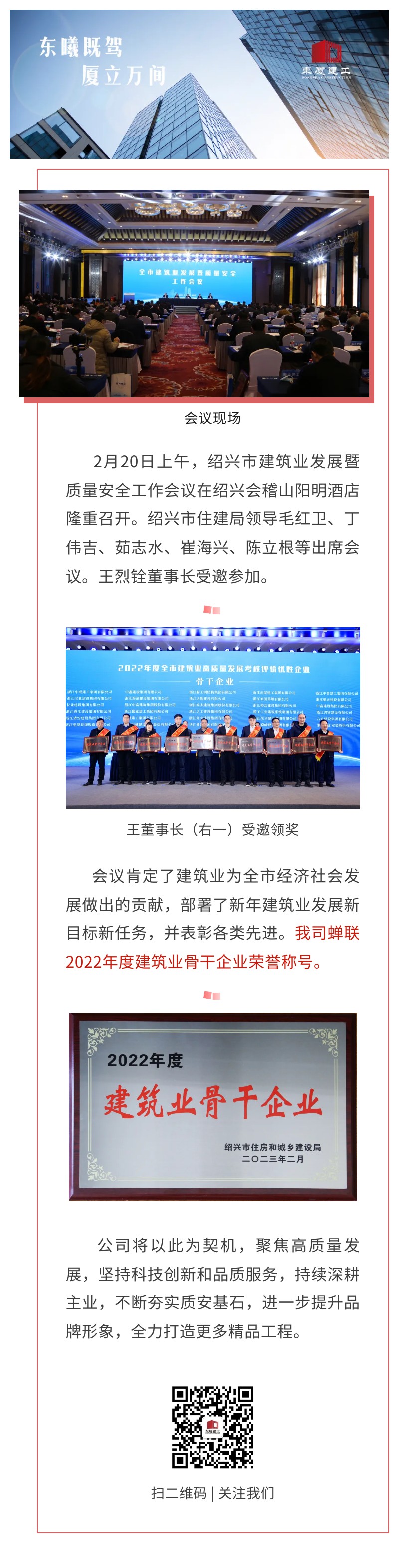 奮楫爭先 篤行致遠(yuǎn) | 公司蟬聯(lián)紹興市建筑業(yè)骨干企業(yè)稱號(hào)