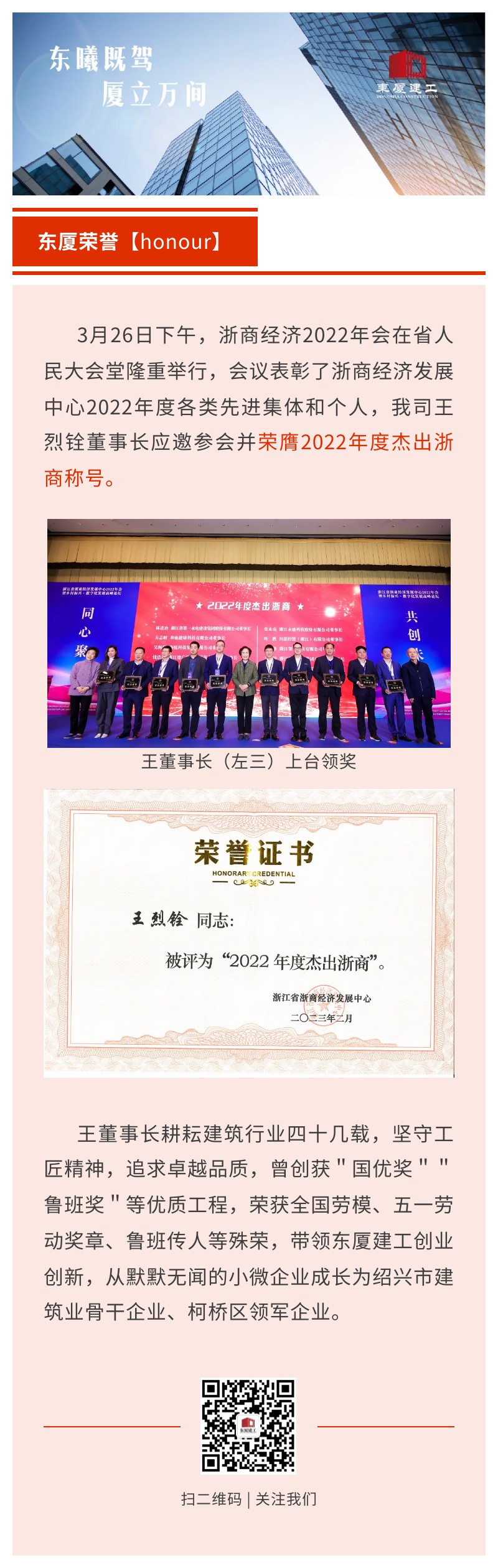 【東廈榮譽(yù)】王烈銓董事長(zhǎng)榮膺2022年度杰出浙商稱號(hào)
