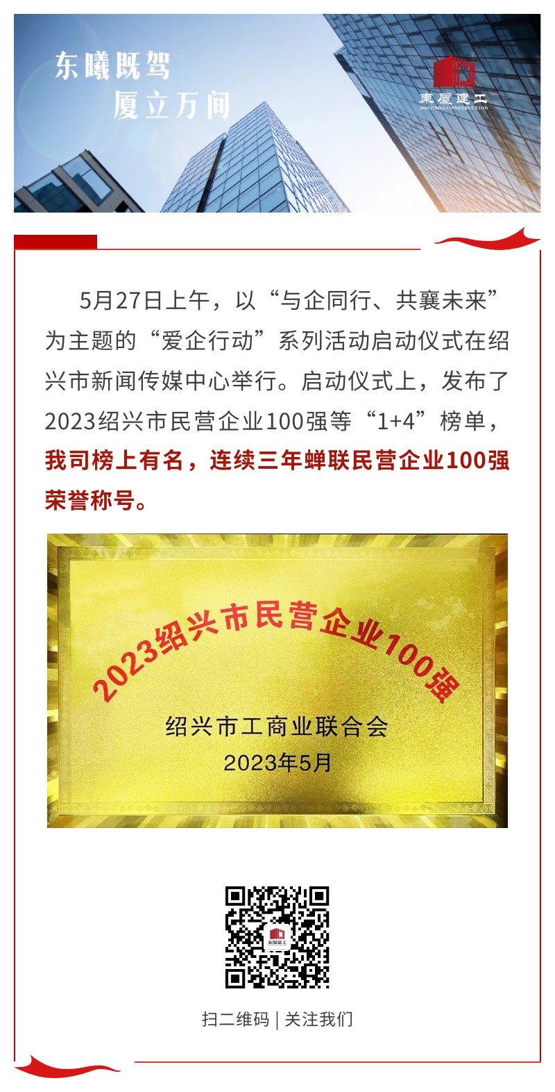 【東廈榮譽(yù)】公司榮膺2023紹興市民營(yíng)企業(yè)100強(qiáng)