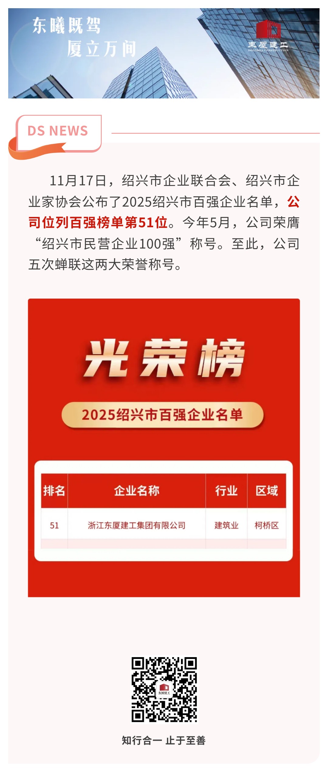 東廈榮譽 | 公司五次蟬聯(lián)“紹興市民營企業(yè)100強”稱號